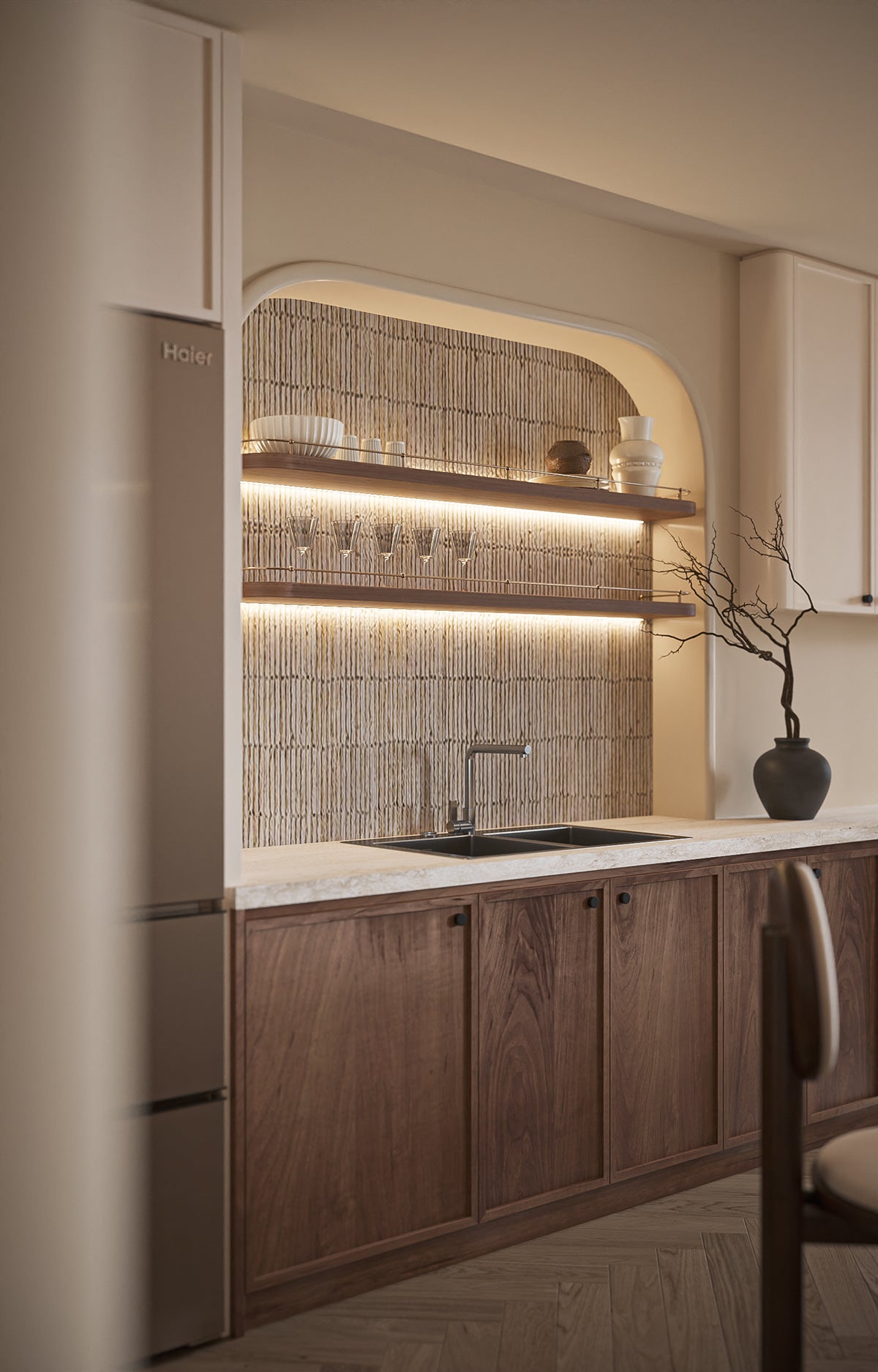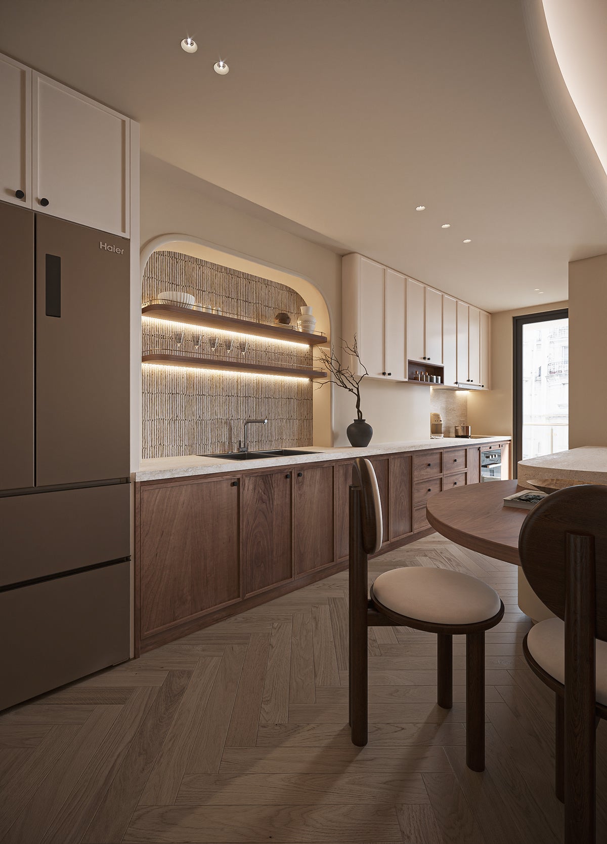 The kitchen features hidden LED lighting under the shelves and cabinets, providing a warm glow that enhances the textures of the stone and walnut materials. This design choice not only creates a cozy ambiance but also improves functionality, making every corner well-lit. Additionally, clever storage solutions are seamlessly integrated, ensuring an uncluttered and stylish kitchen.